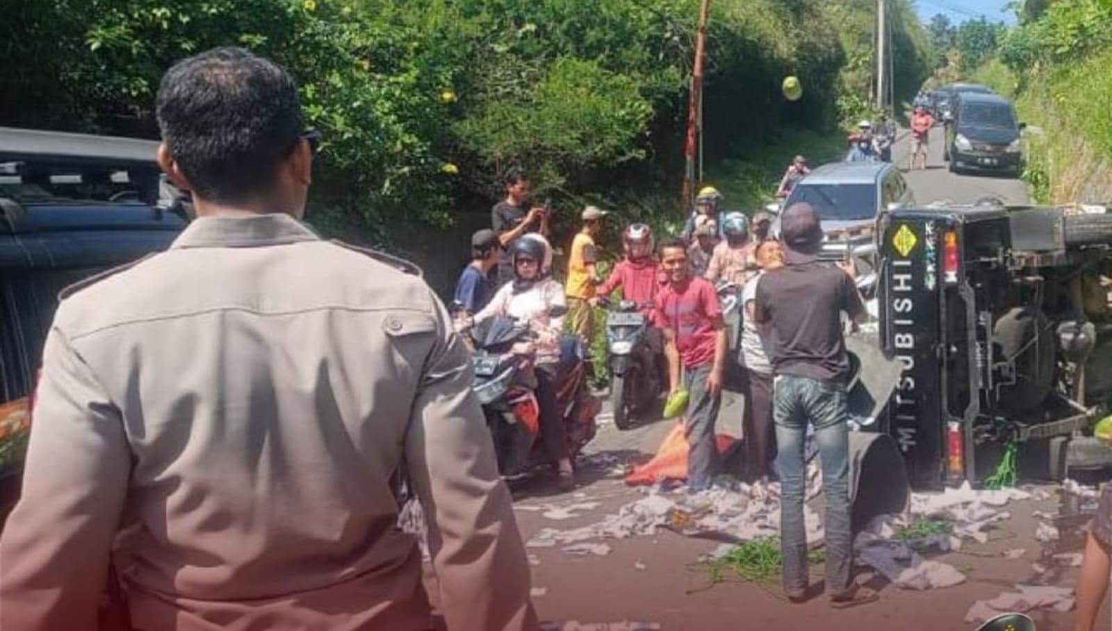 Dari gelar olah TKP yang kami lakukan diduga Penyebab terjadinya kecelakaan lalulintas tersebut diakibatkan oleh muatan berlebih pada kendaraan tersebut. Sementara itu akibat kejadian tersebut tidak sampai menelan jatuhnya korban jiwa, hanya saja menimbulkan kerugian materil akibat kerusakan yang dialami mobil tersebut dan muatan sayuran yang bertumpahan terbalik”Pungkas Kapolsek Eddy